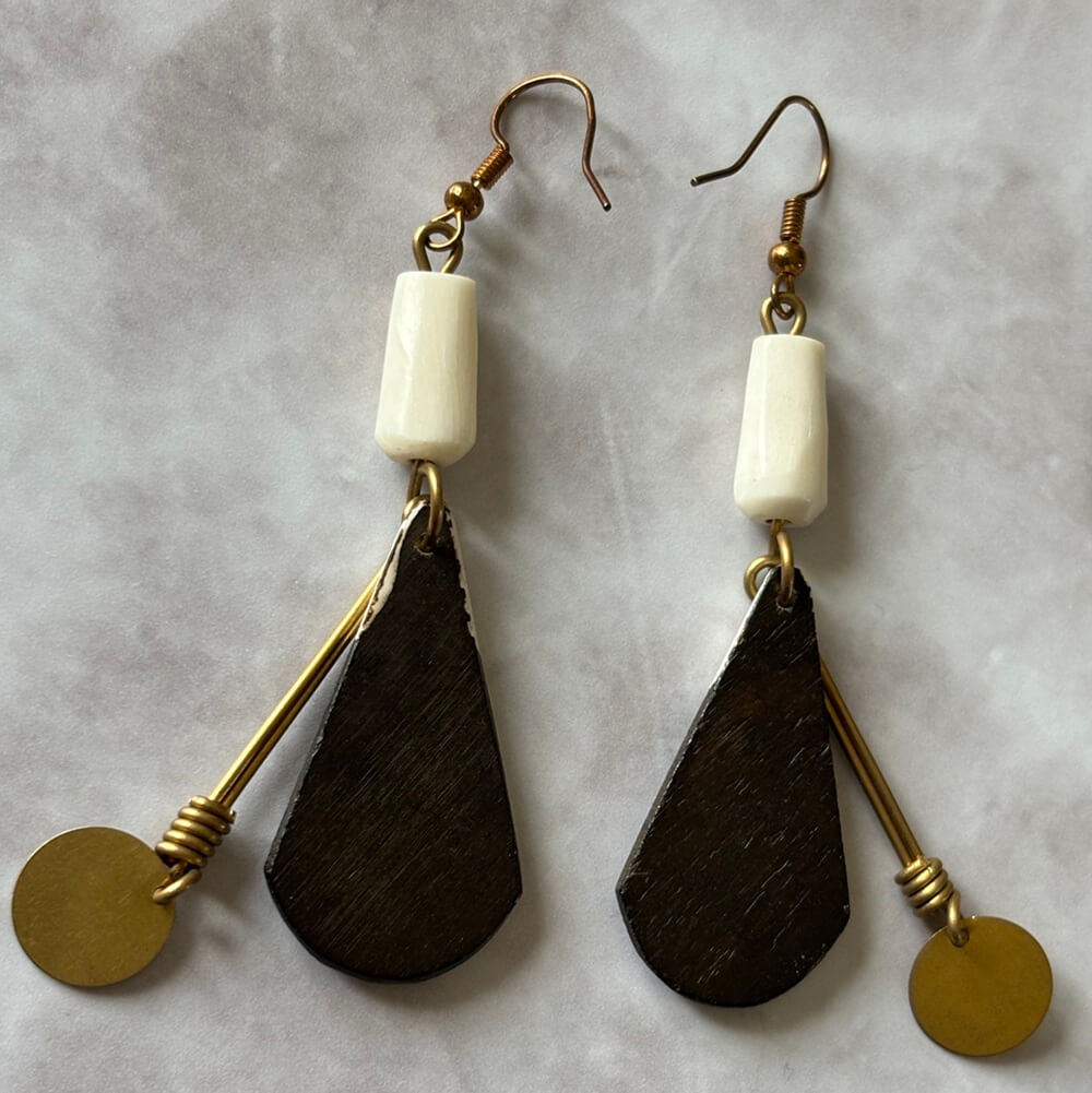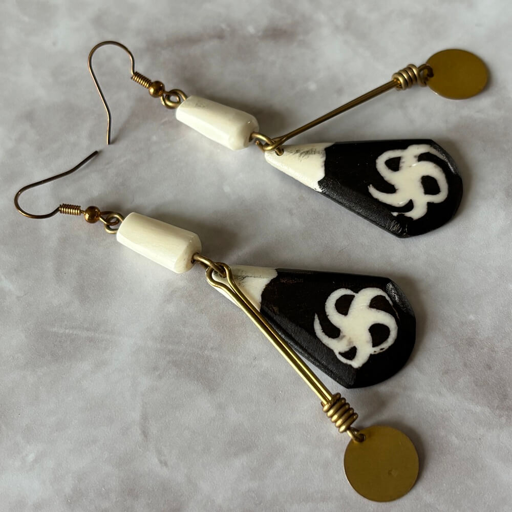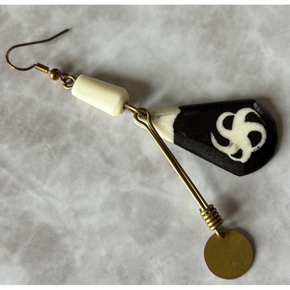 アフリカの伝統素材である動物の骨を使ったピアス。ブラックとホワイトのコントラストが鮮やかで、エキゾチックな雰囲気が漂います。アーティスティックで個性的な耳元を演出してくれます。