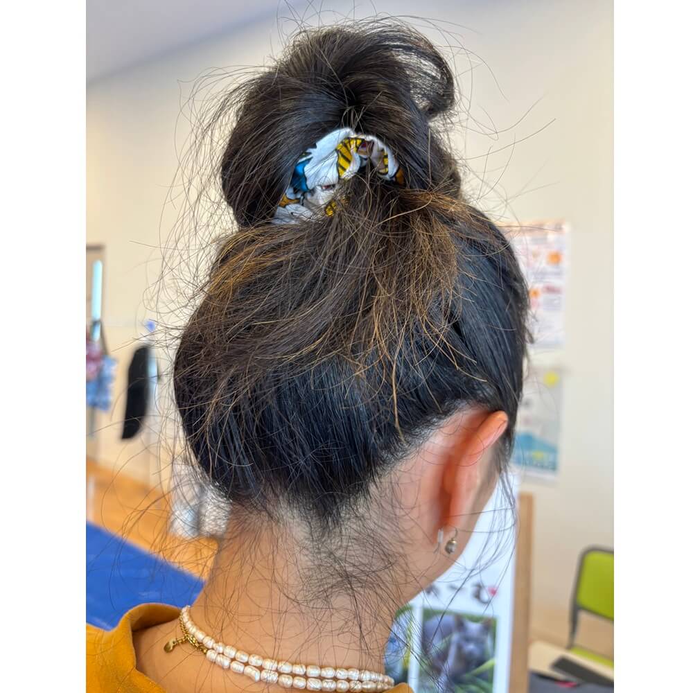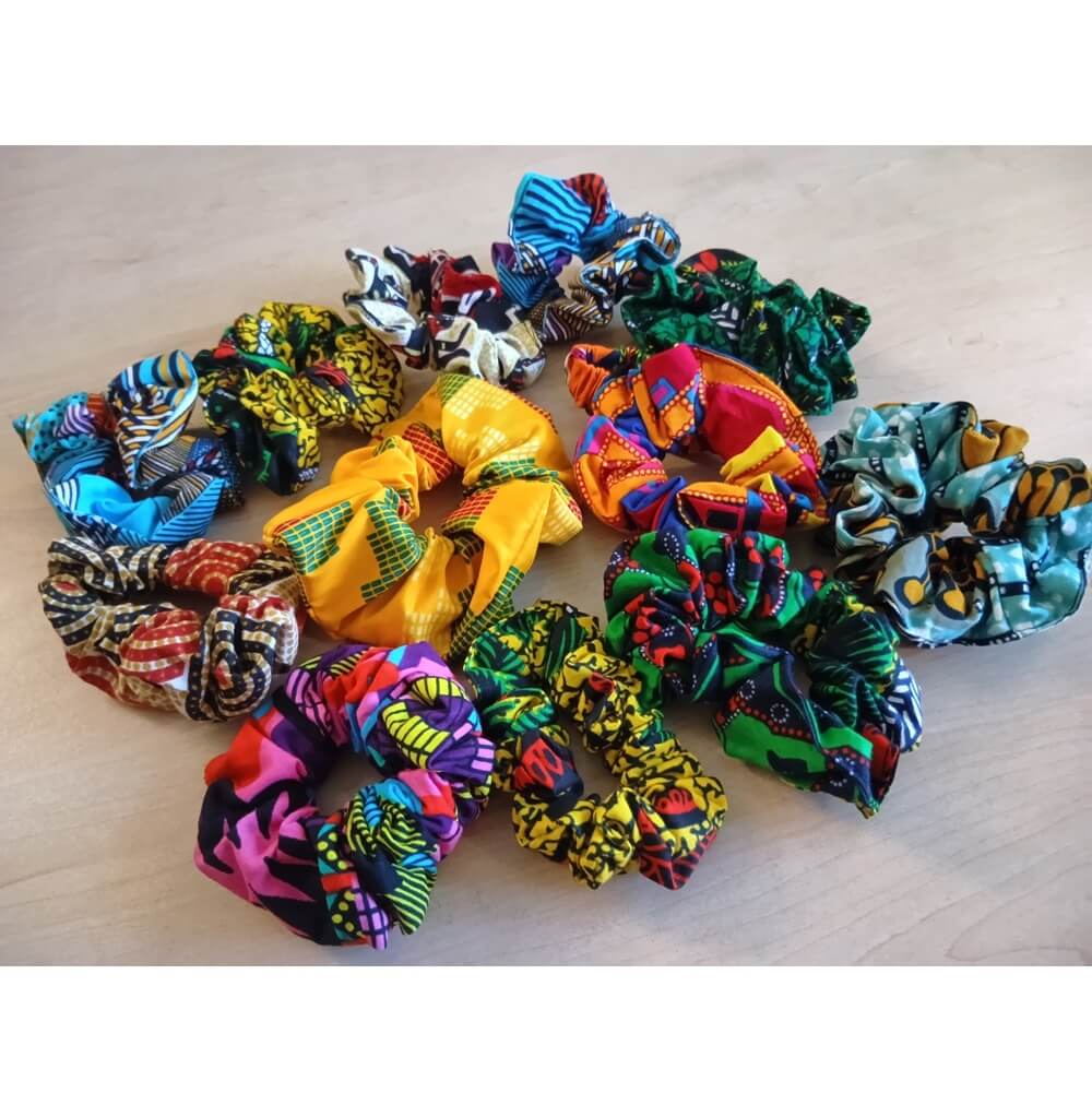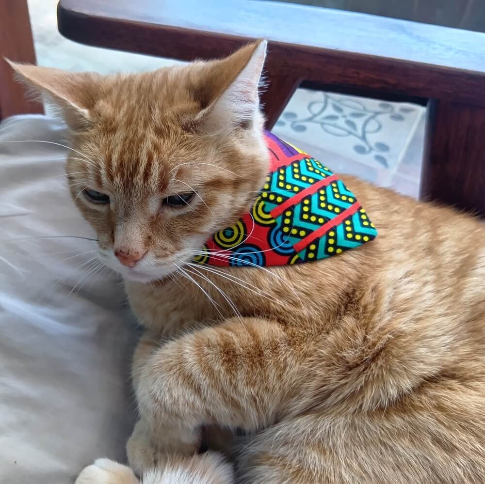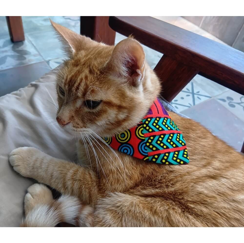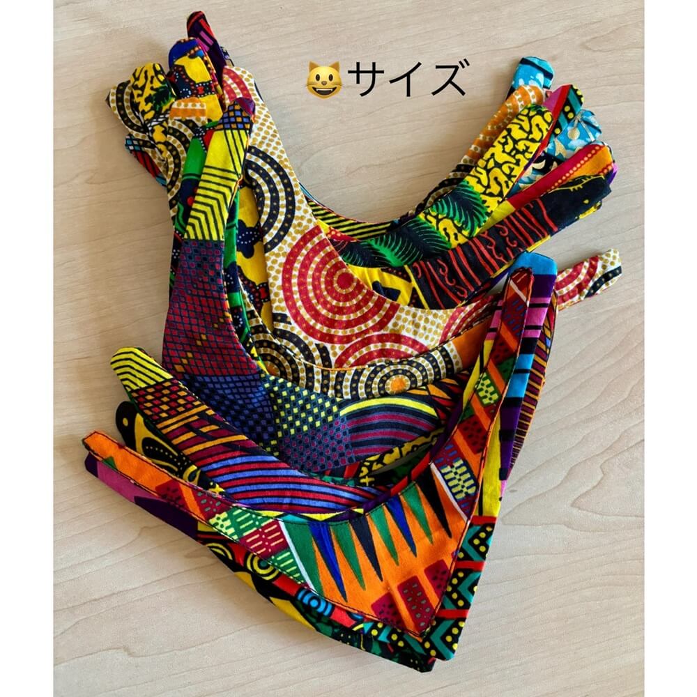 猫ちゃん用は、同じアフリカ布の端切れを使った飼い主さん用のシュシュもセット。