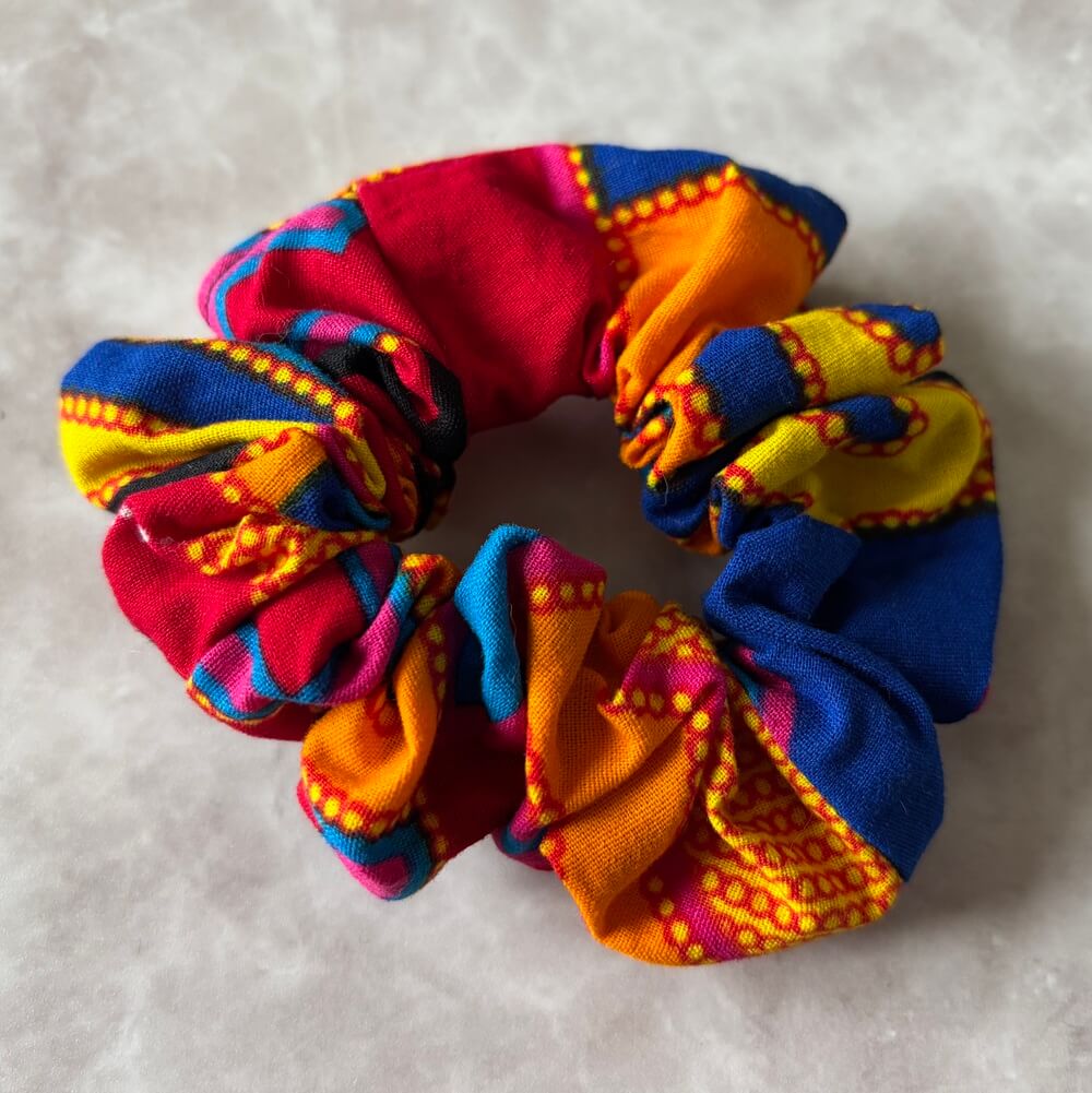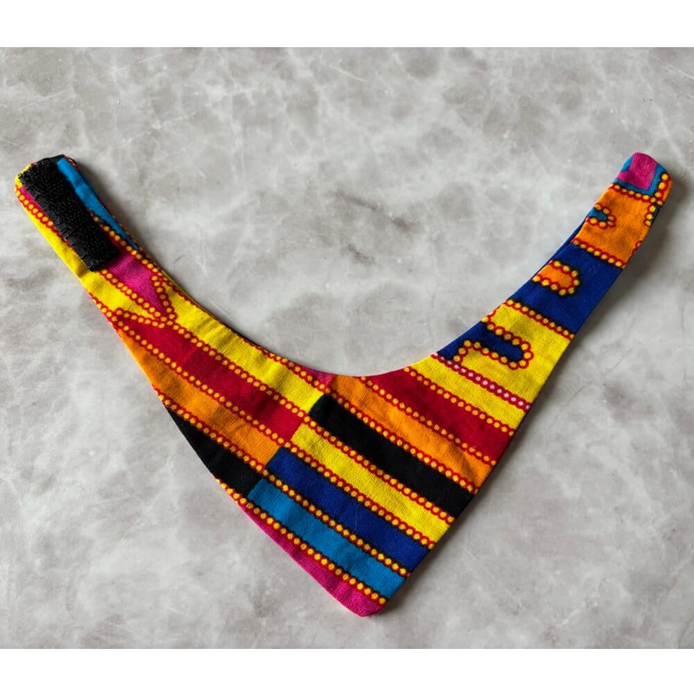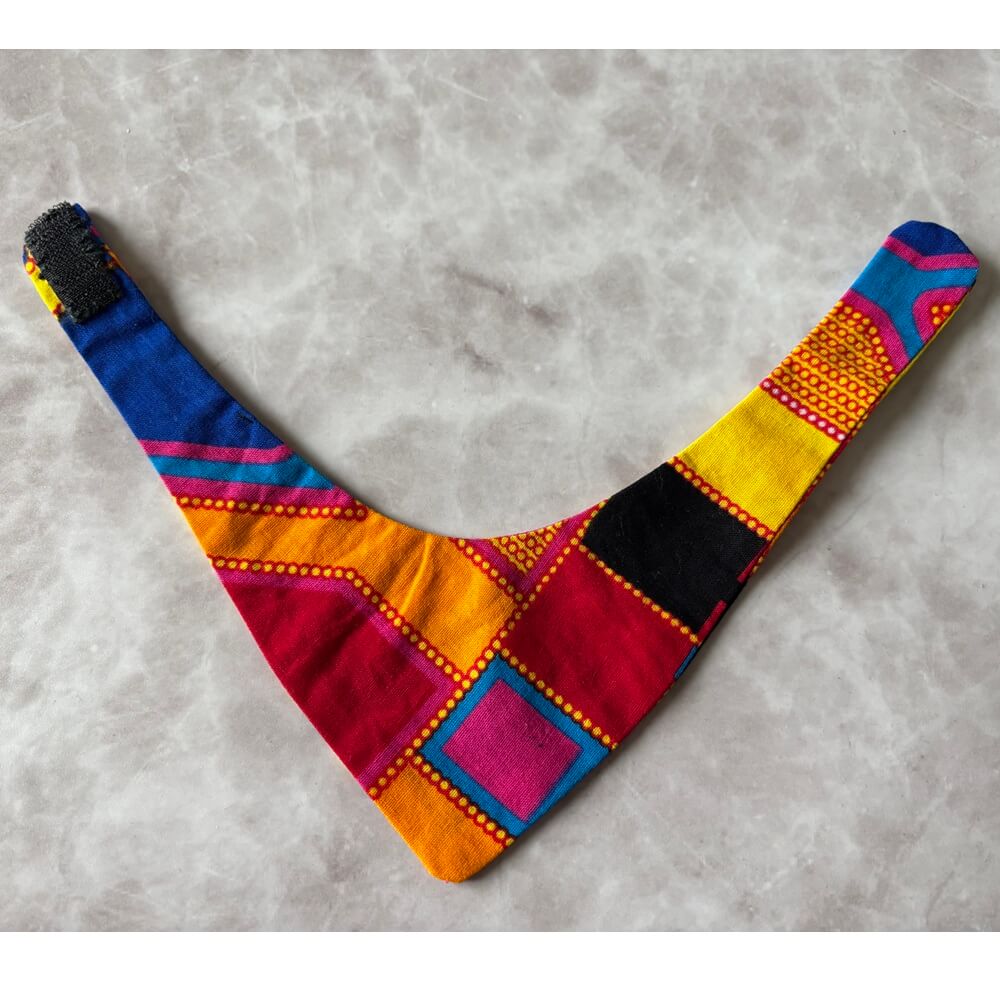 カラフルで見ているだけで元気が出るアフリカ布を使った、くらふぁーむオリジナルのバンダナです。