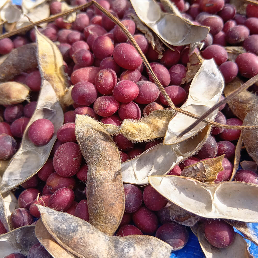 赤みがかった艶のある全粒の赤大豆。炊くとふっくら、乾煎りすれば香ばしく、ご飯・スープ・サラダ・おやつまで幅広く活躍します。